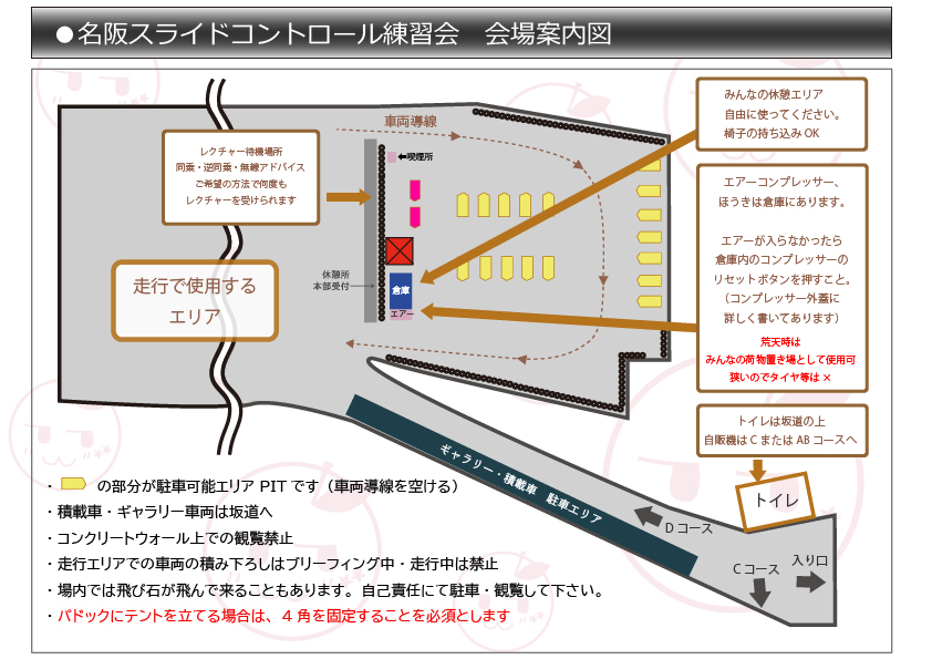 場内で起きた、事故、盗難、トラブル等については一切責任を負えません。
