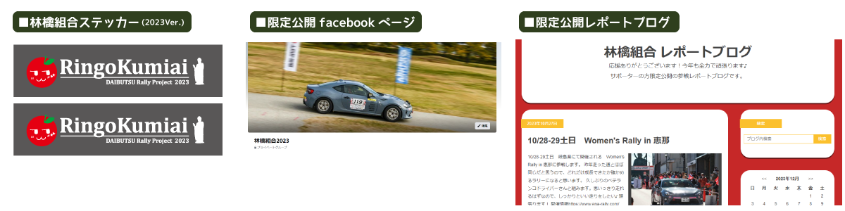 【林檎組合サポーター 1口 ¥10,000】 ※何口でも可能です ラリーを一緒に楽しんで応援して頂くプランです。 今年は初の試み、同乗体験会・交流会も開催します!遠方の方のためのオンライン交流会も検討中。 ①ラリー同乗体験ありの感謝会へご招待!(中部近郊・土日開催予定) ラリー車の同乗体験を行って頂けるイベントを考案中!(林道を検討中) 同時に広場走行会も行います。3口以上お申込みいただいた方はそちらへも無料ご招待! ②競技参戦レポート、オンボード映像をお届け facebook非公開グループページ、または限定公開ブログにてレポートをお届けします。 (Facebookの方が更新頻度が高いです) ③2024年サンクスステッカーをプレゼント 林檎組合サポーター限定ステッカーと、ほっこりサポーターステッカー両方ををお届け。(夏頃お届け予定) ④本サイトにてお名前の掲示(ご希望の方のみ) |